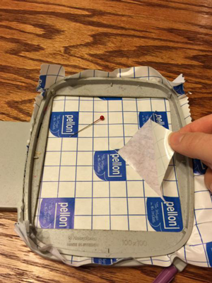 Peel away backingPeel away backing is hooped with or without the backing attached. You would just make that decision based on personal preference and what will work best for your particular project. If the sticky is hooped with the backing attached, after it is hooped, you can score the backing in an X shape with a straight pin to make it easier to peel away.